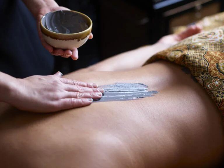 Applying healing mud packs to reduce inflammation, detoxify the body, and improve skin health.