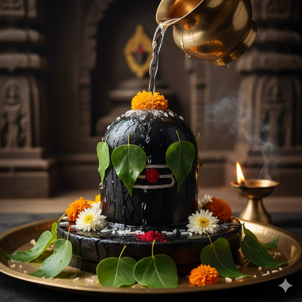 In this puja, the Shiva Linga is bathed with sacred offerings like water, milk, curd, honey, ghee, and sugar (collectively called Panchamrit), while chanting Sri Rudram and other Shiva mantras.
