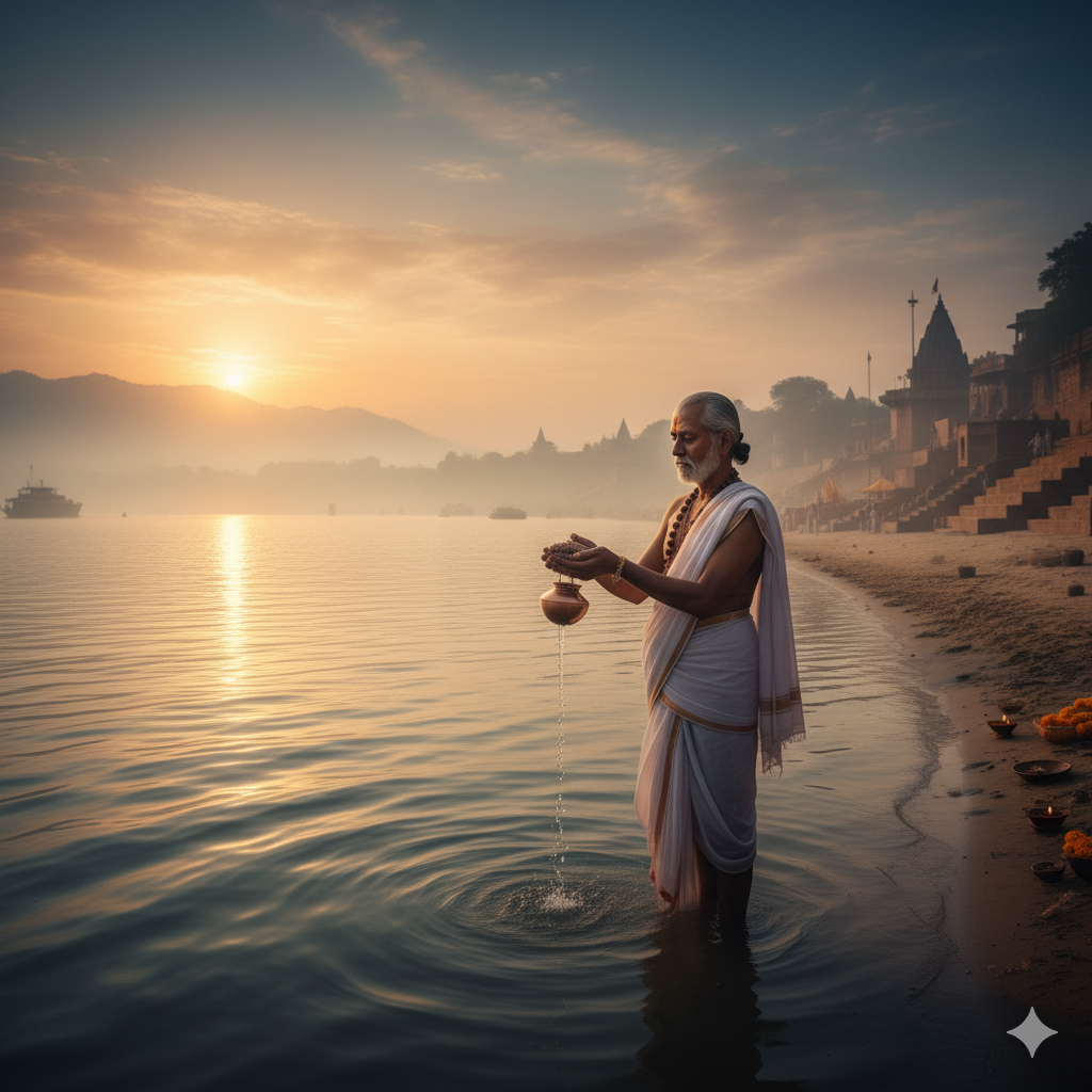 Water mixed with sesame seeds is offered while chanting mantras to pacify ancestors.